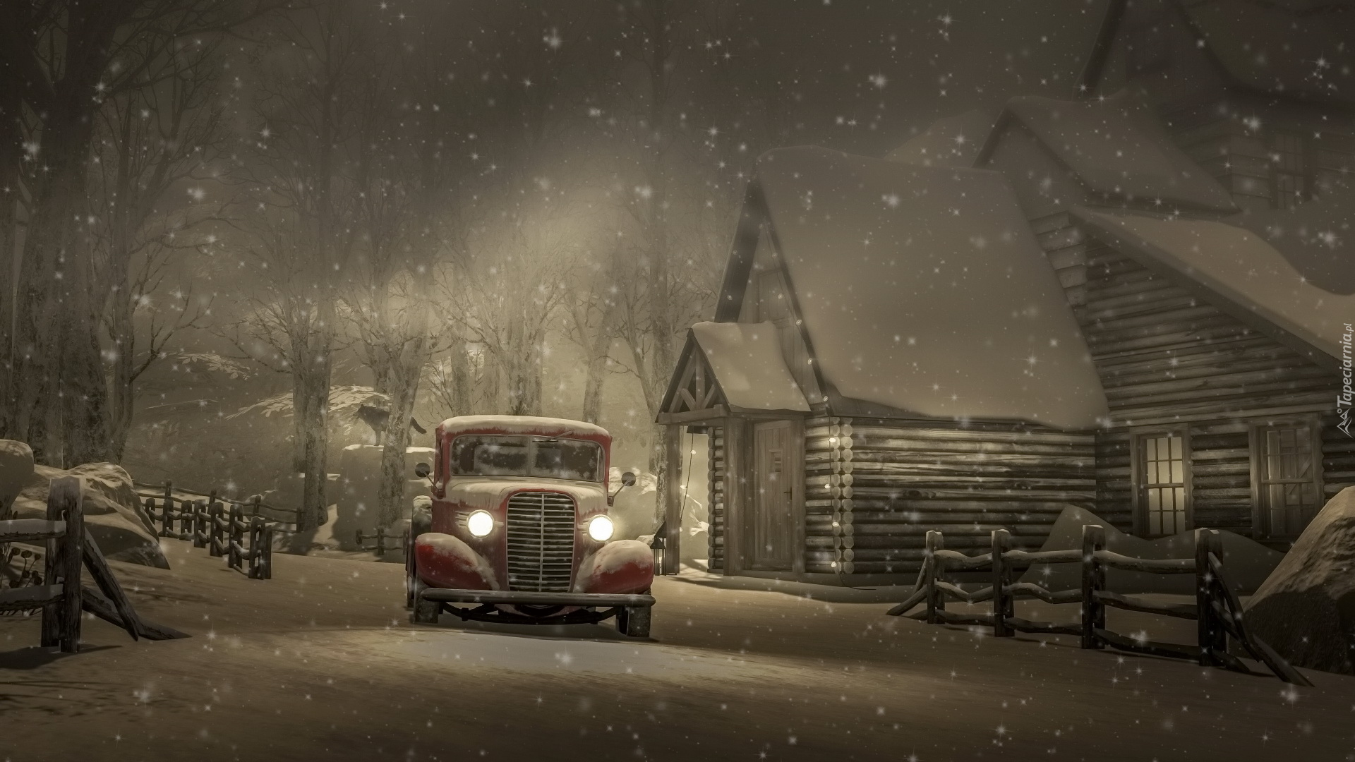 Edytor tapety: Samochód obok drewnianego domu zimową porą