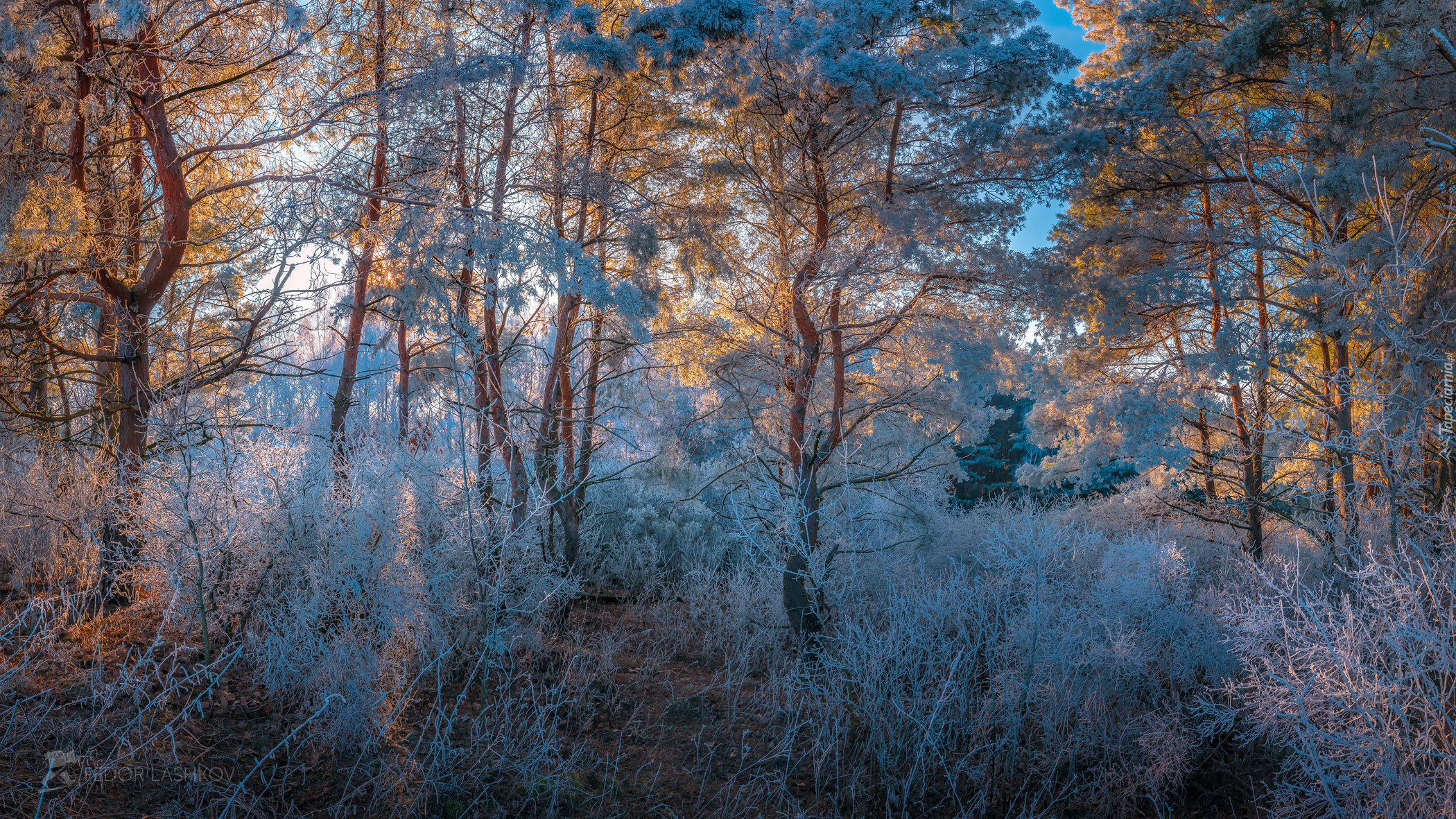 Edytor tapety: Rozświetlone słońcem oszronione drzewa i krzewy w lesie