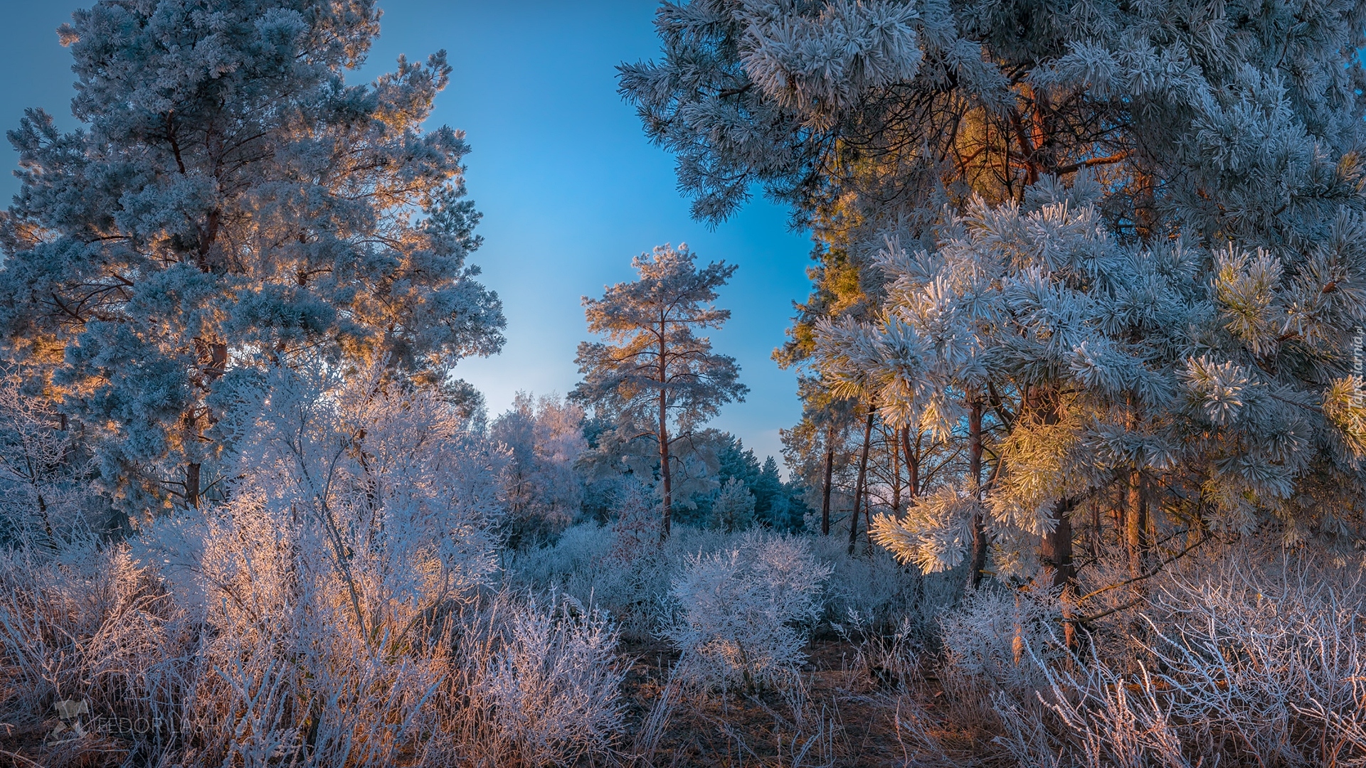 Edytor tapety: Rozświetlone słońcem oszronione drzewa i krzewy