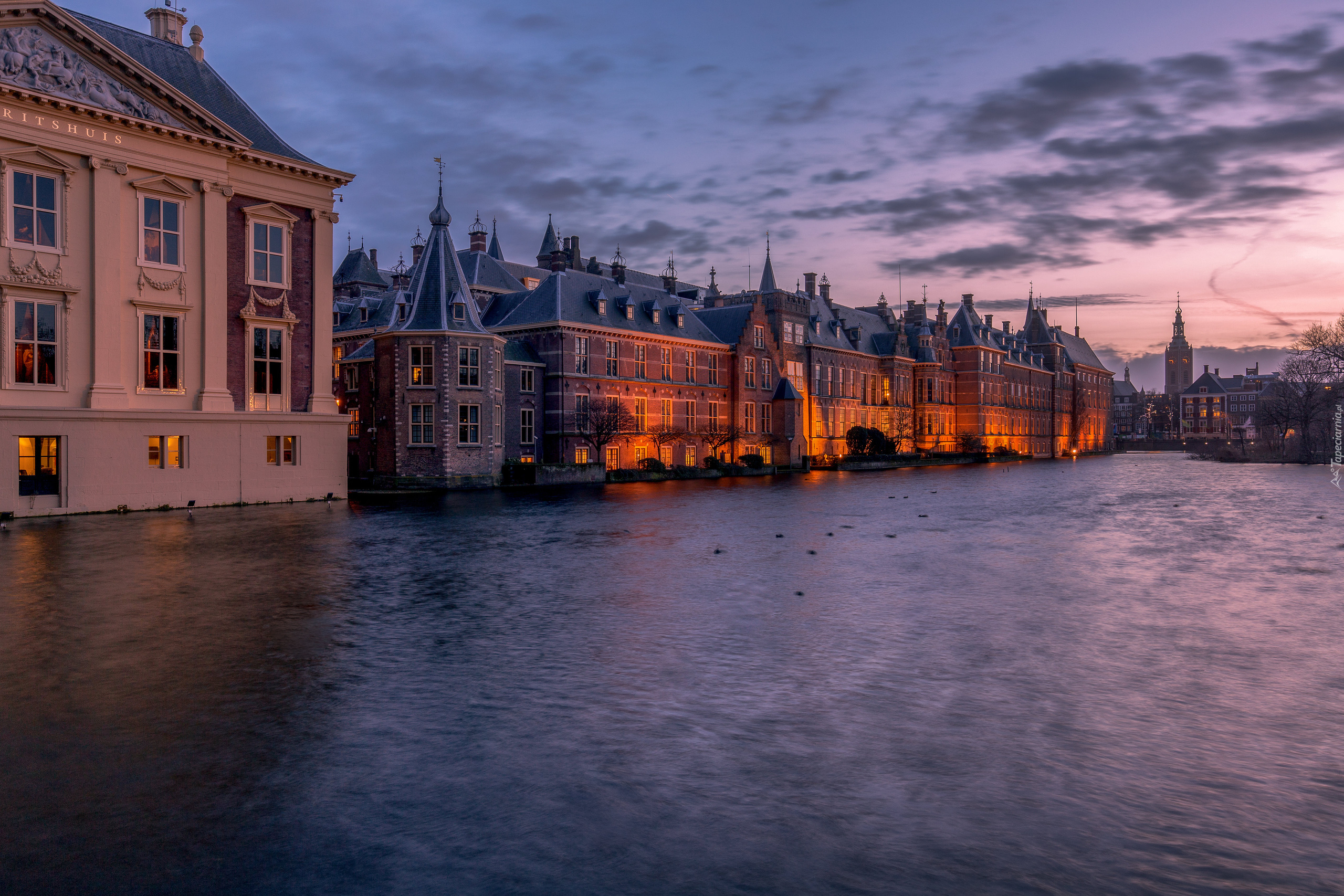 Edytor tapety: Domy nad kanałem Afvoerkanaal w Hadze wieczorową porą