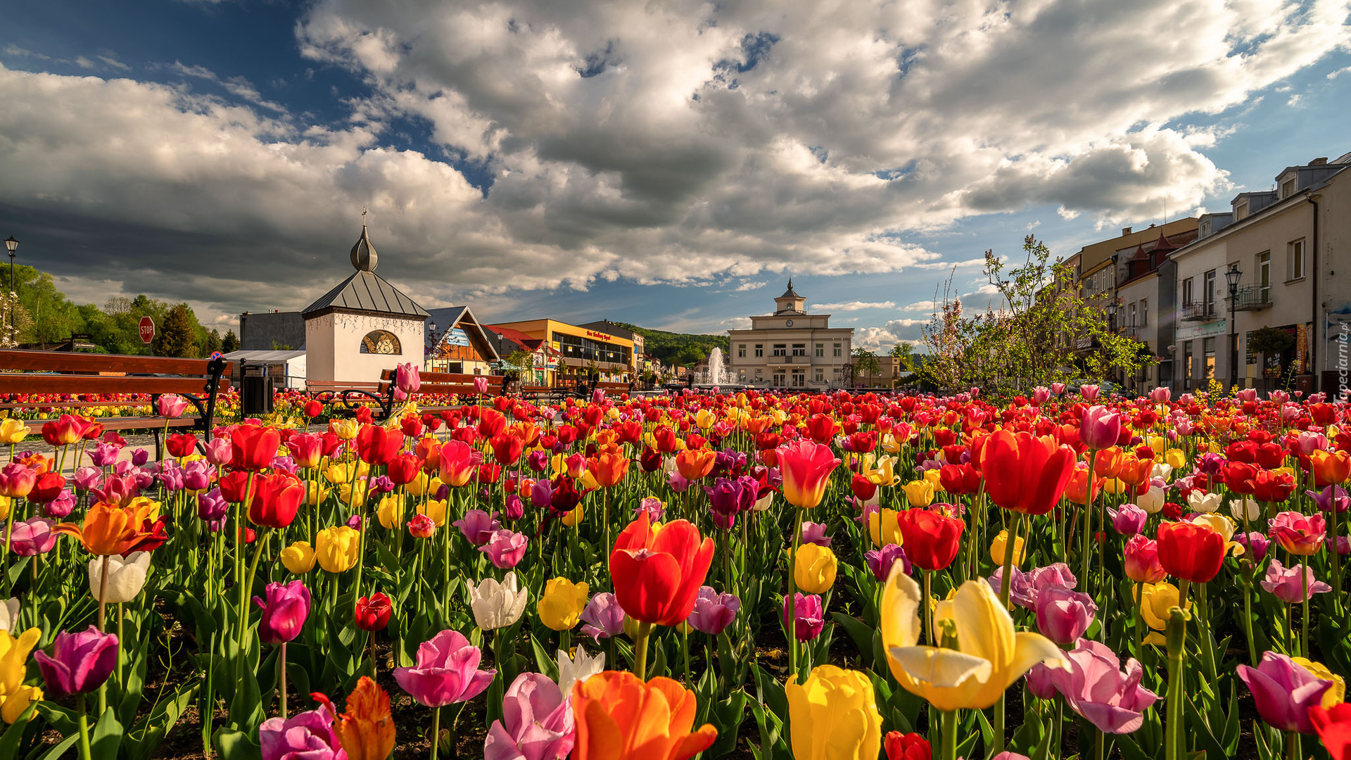 Edytor tapety: Kolorowe tulipany na rynku w Muszynie