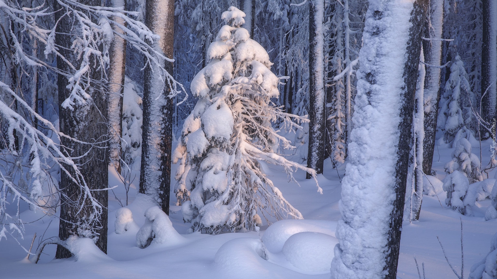 Edytor tapety: Rozświetlone ośnieżone drzewo w zimowym lesie