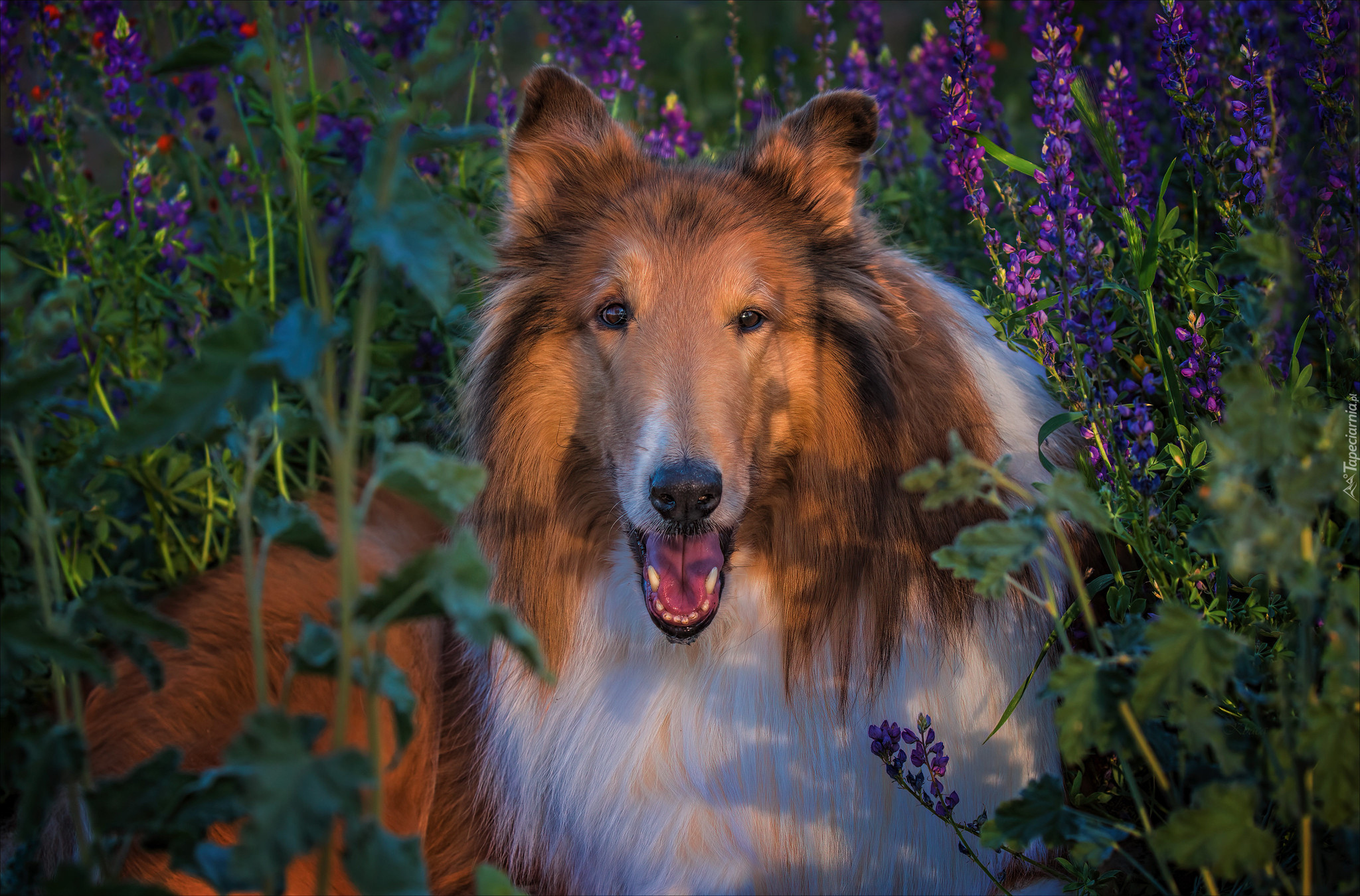 Edytor tapety: Owczarek szkocki długowłosy w kwiatach