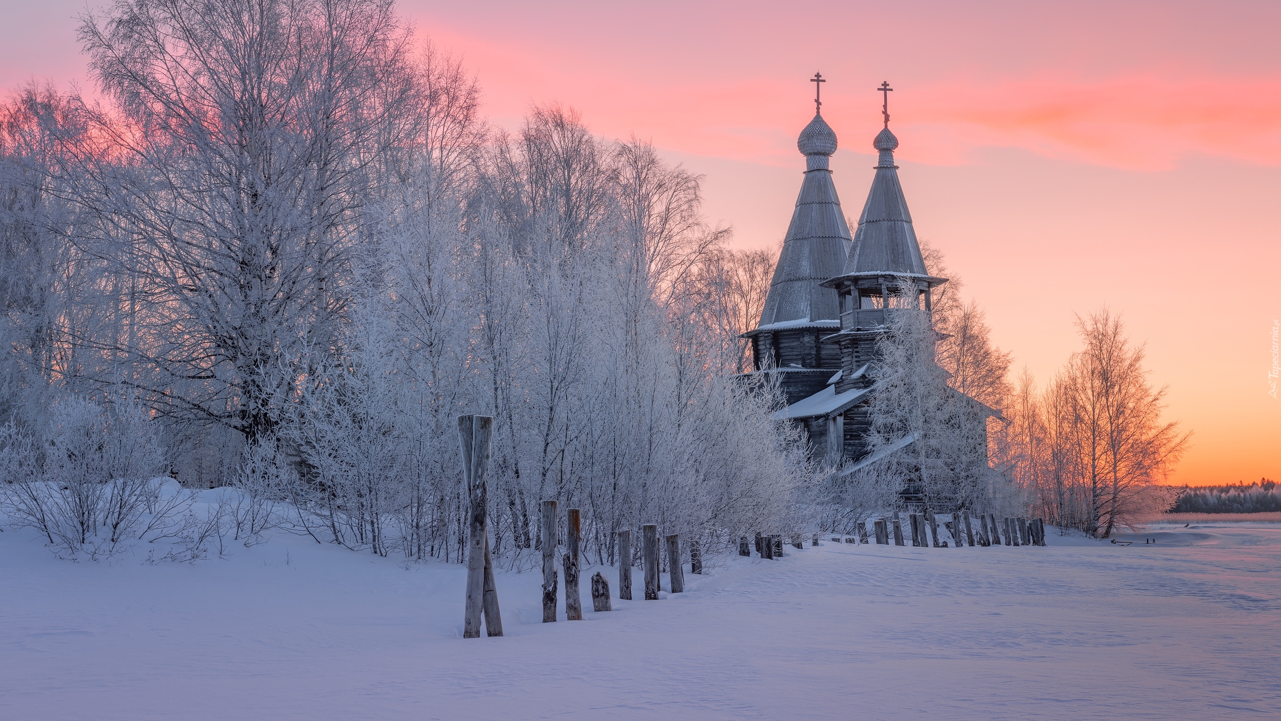 Edytor tapety: Ośnieżone drzewa i cerkiew we wsi Chelmuzhi