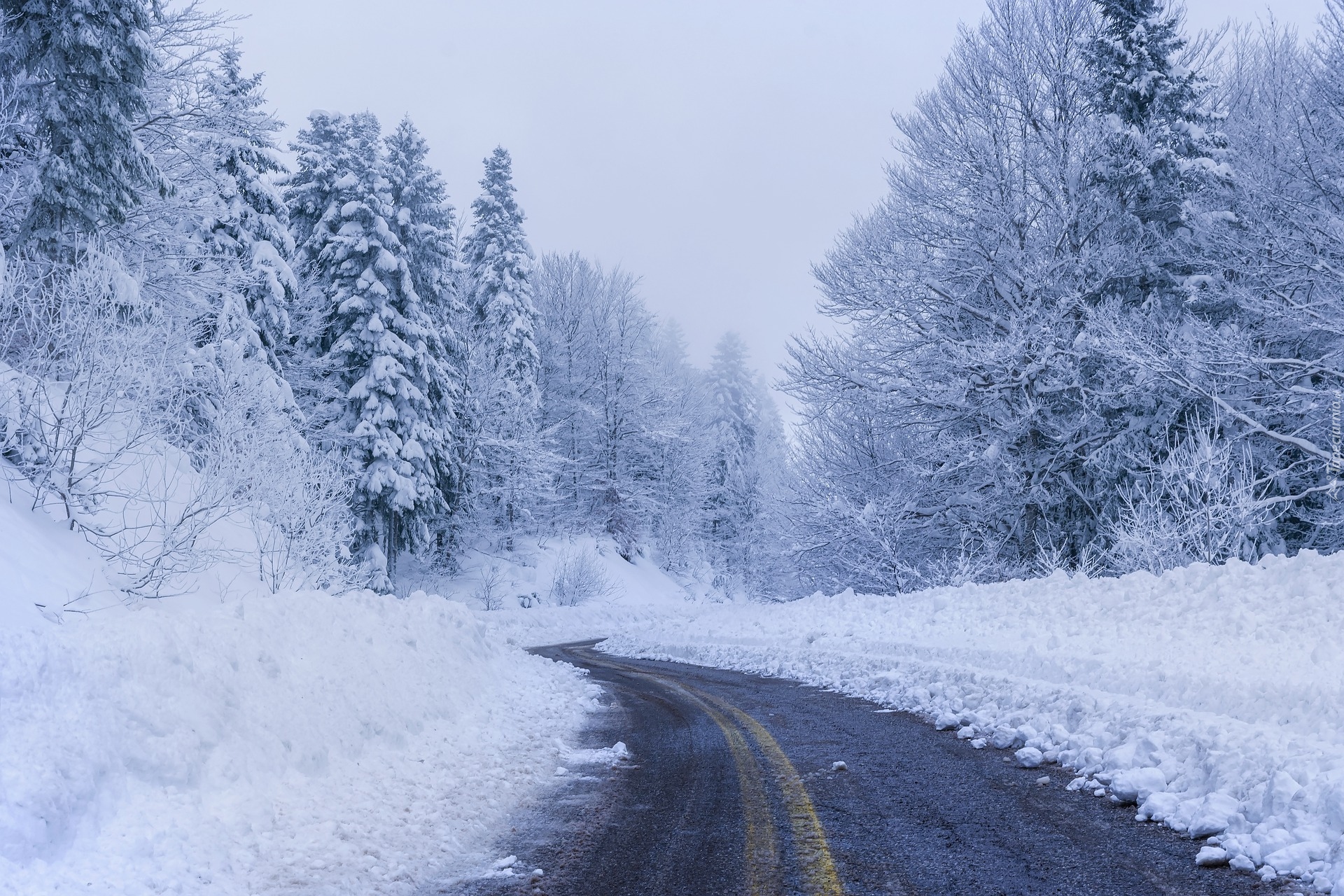 Edytor tapety: Ośnieżone drzewa po obu stronach asfaltowej drogi