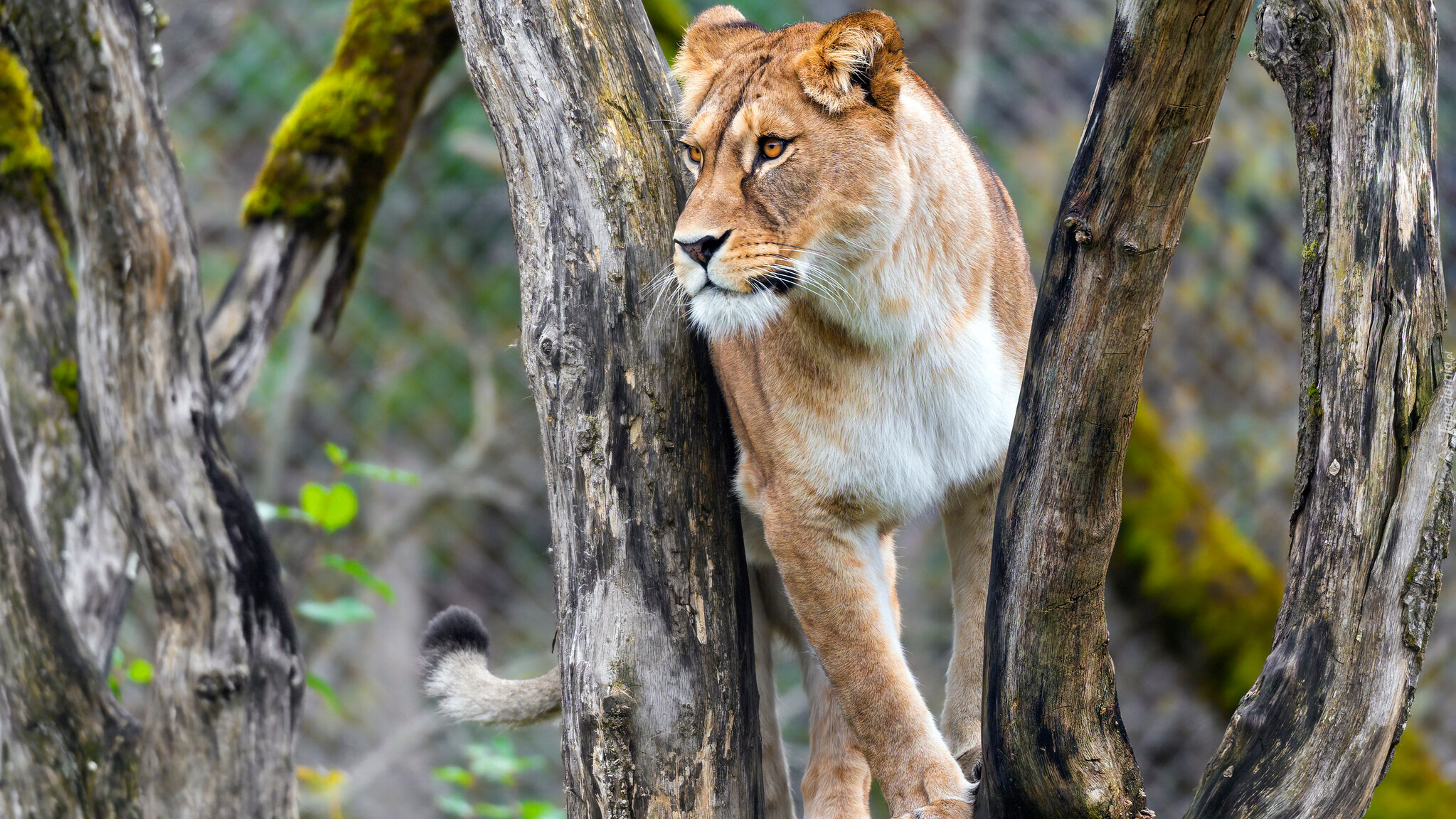Edytor tapety: Lwica na suchym drzewie
