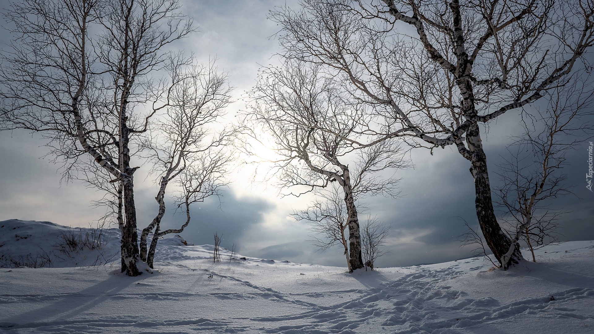 Edytor tapety: Bezlistne brzozy i ślady w śniegu