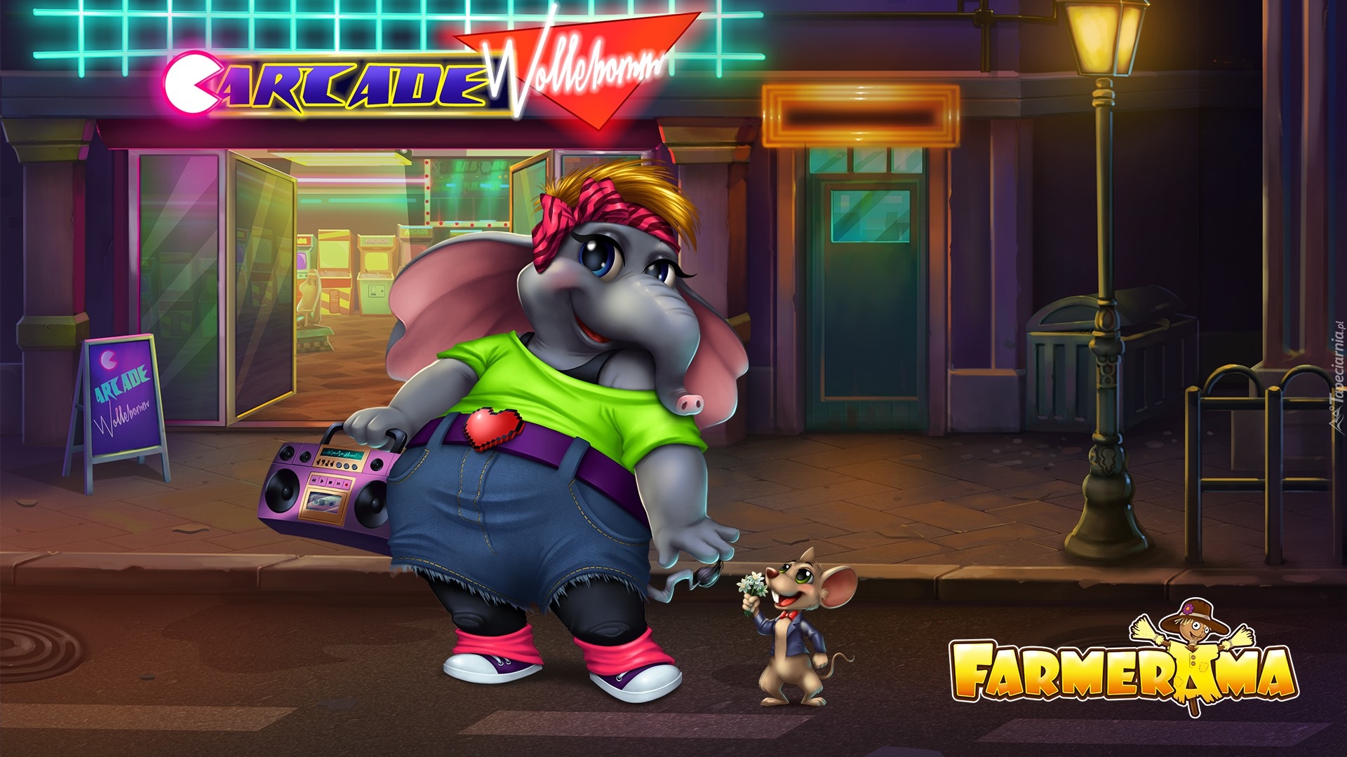 Edytor tapety: Słoń i myszka na ulicy z gry Farmerama