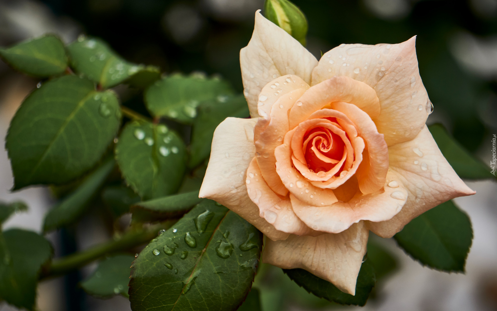 Edytor tapety: Krople wody na płatkach róży i liściach