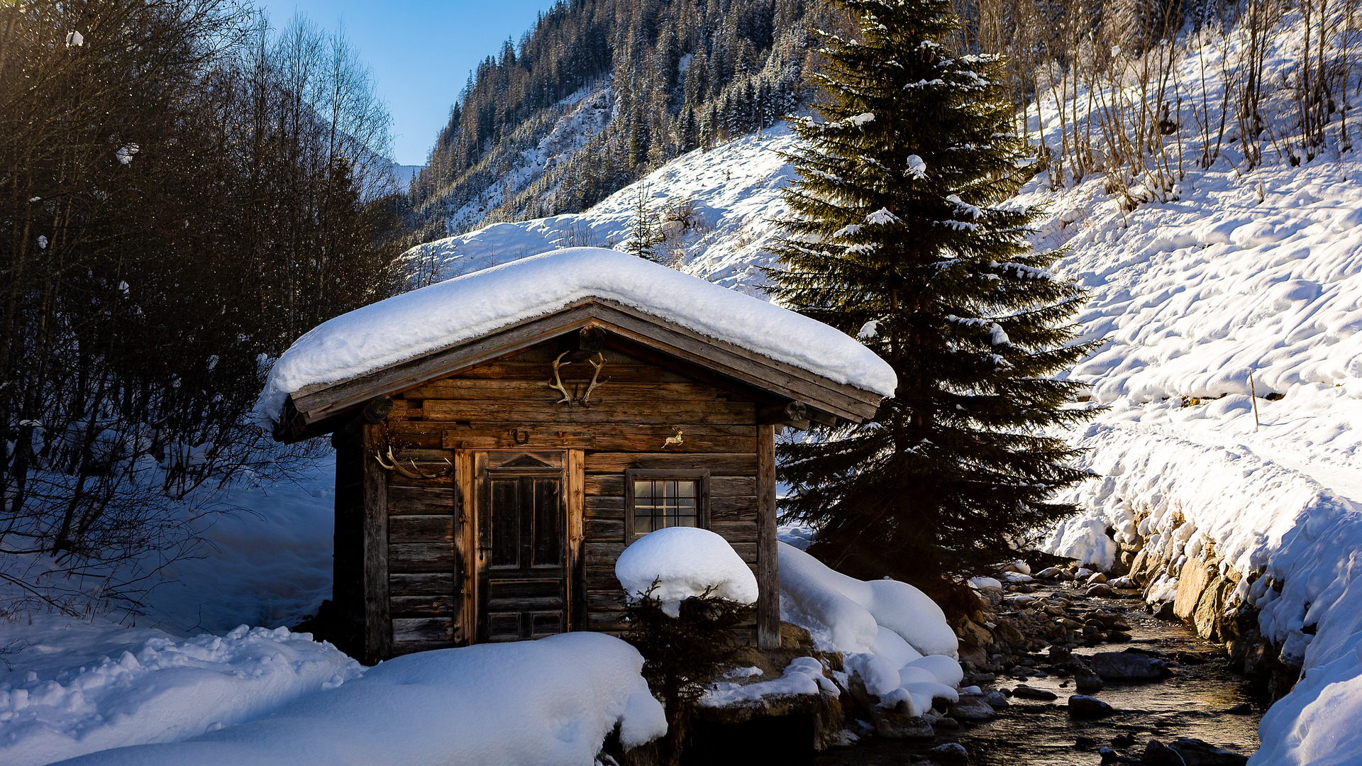 Edytor tapety: Drewniany dom nad górskim potokiem w zimowej scenerii