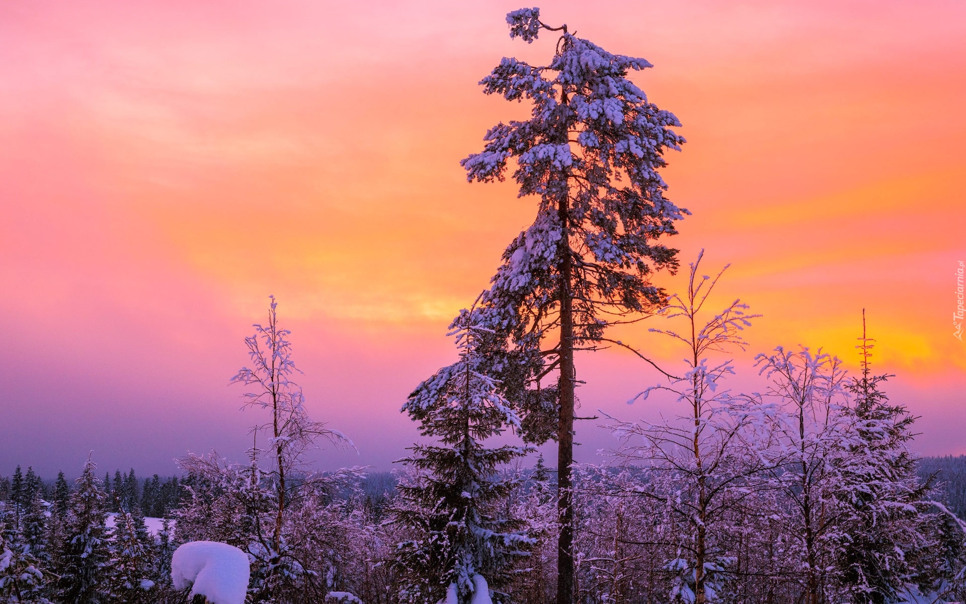 Edytor tapety: Ośnieżone drzewa pod kolorowym niebem
