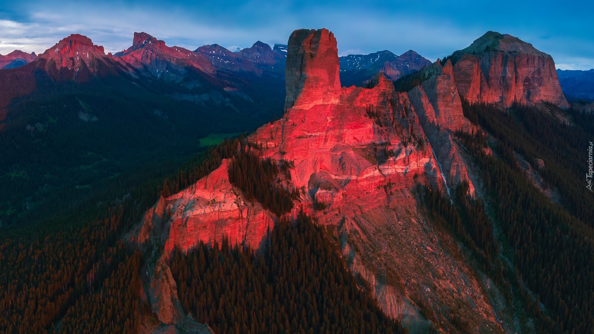 Edytor tapety: Rozświetlona Chimney Mountain w Kolorado