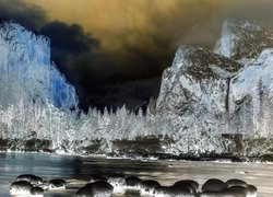 Edytor tapety: Ośnieżona góra El Capitan i rzeka Merced River zimową porą