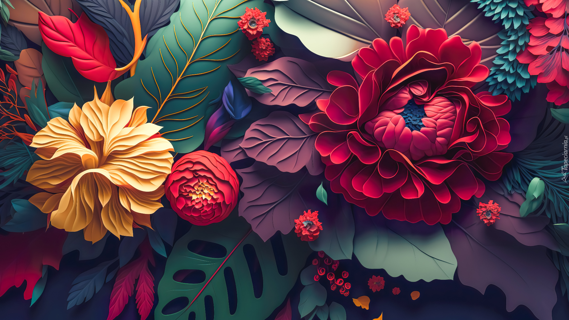 Edytor tapety: Kolorowe kwiaty na liściach w grafice