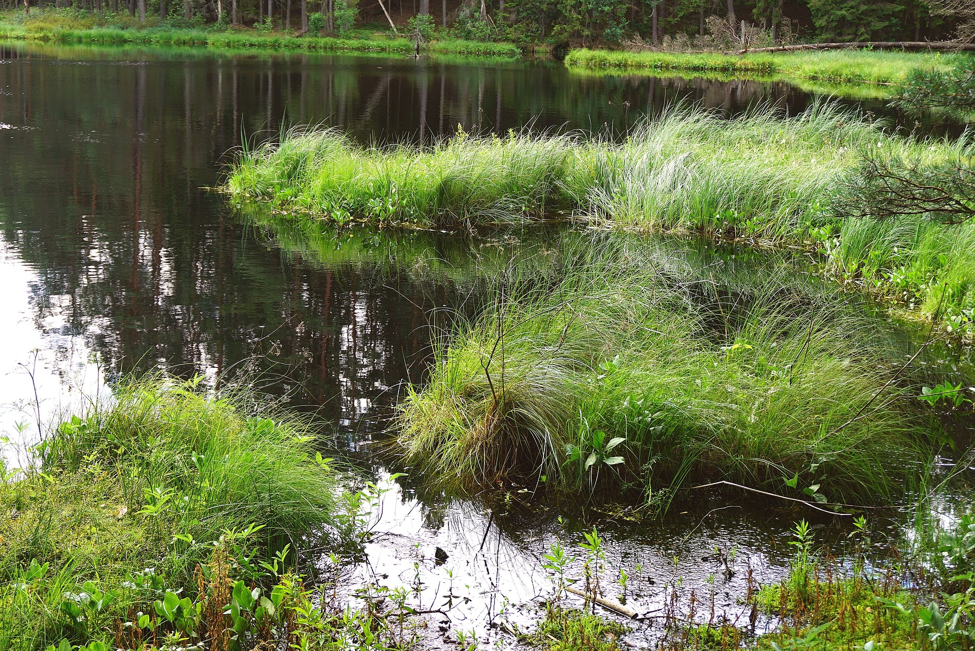 Edytor tapety: Kępki traw w leśnym stawie
