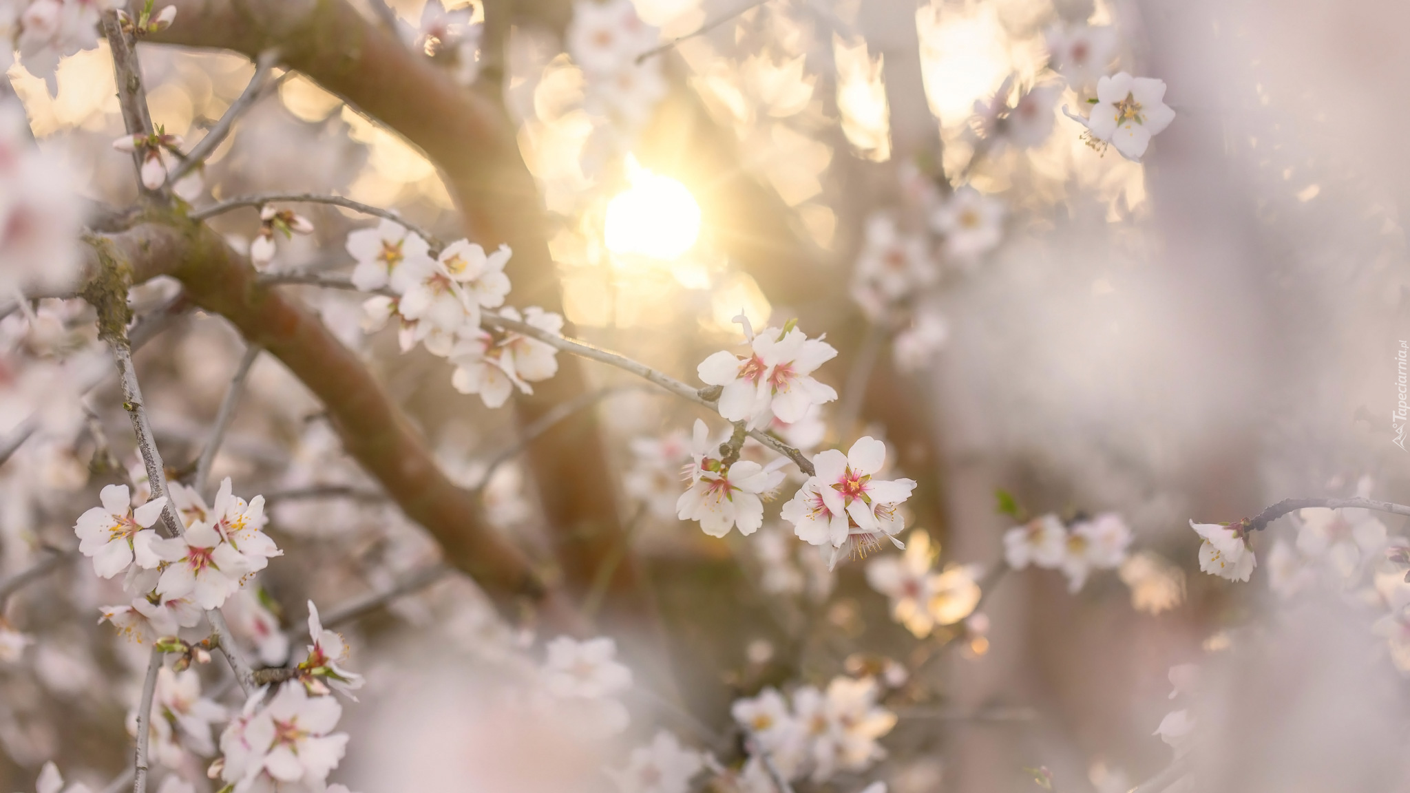 Edytor tapety: Rozświetlone słońcem kwitnące drzewo owocowe