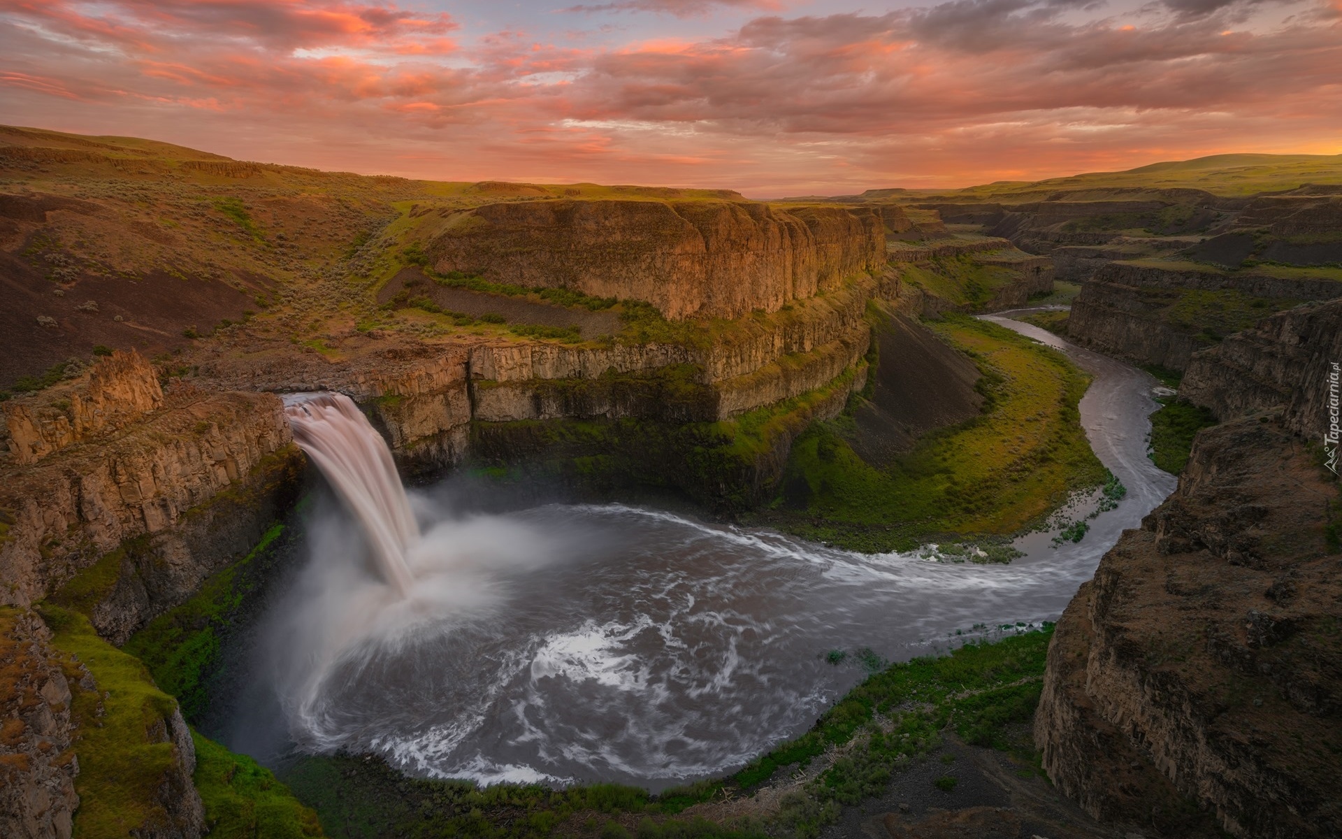 Edytor tapety: Wodospad Palouse Falls wpadający do rzeki Palouse River
