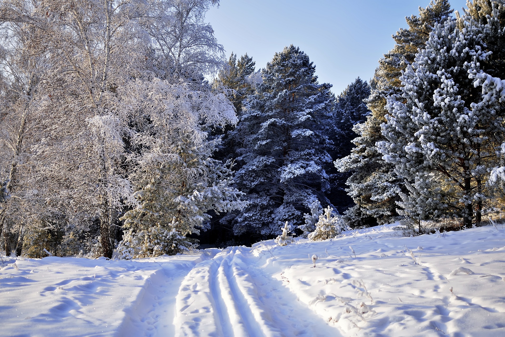 Edytor tapety: Ośnieżone drzewa przy zaśnieżonej drodze do lasu