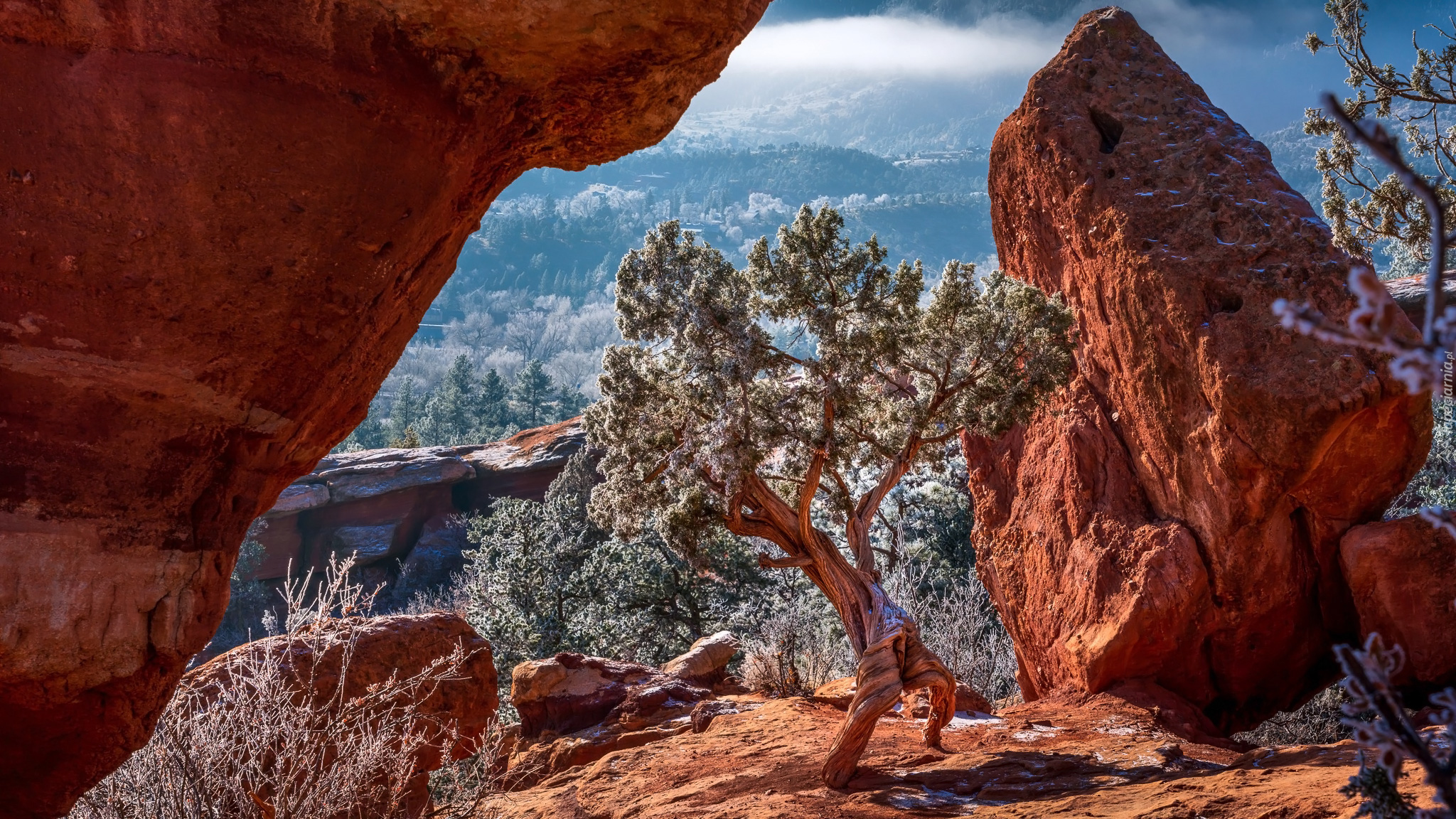 Edytor tapety: Rozświetlone ośnieżone drzewa i skały