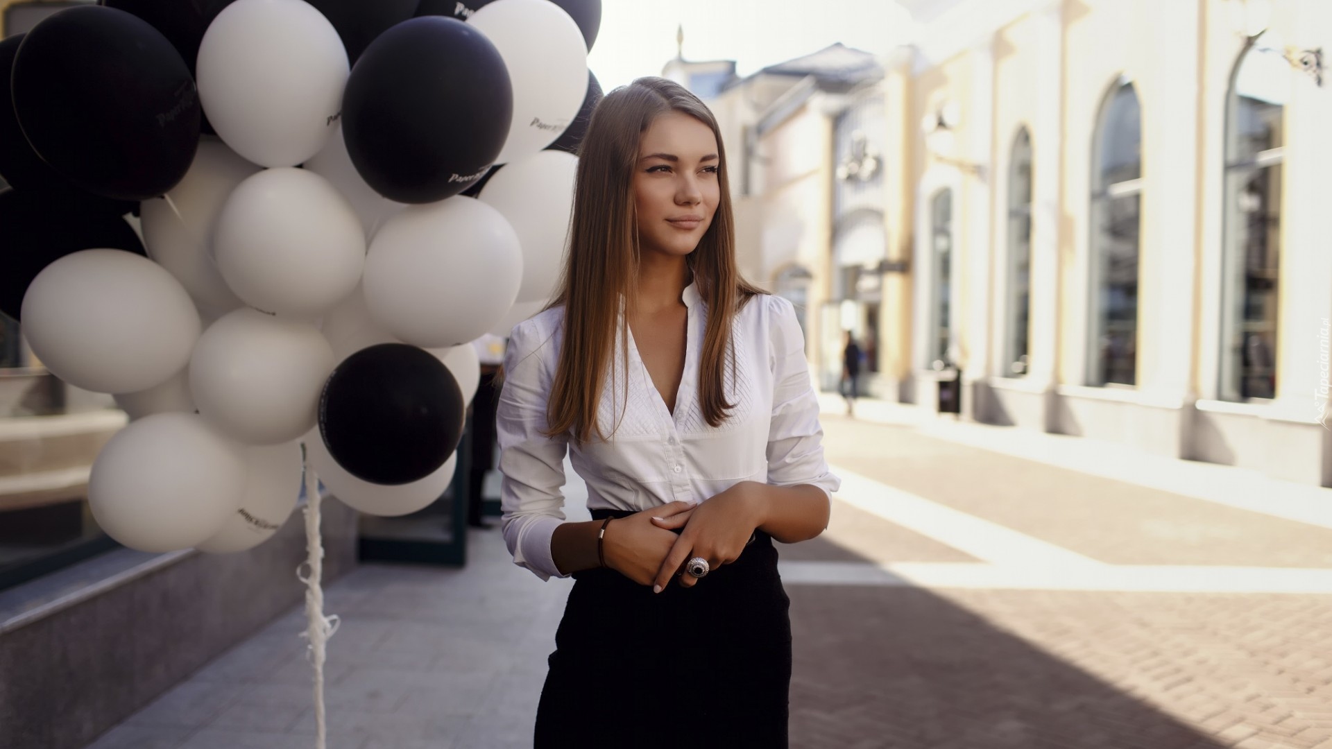 Edytor tapety: Długowłosa kobieta w białej bluzce i czarnej spódnicy
