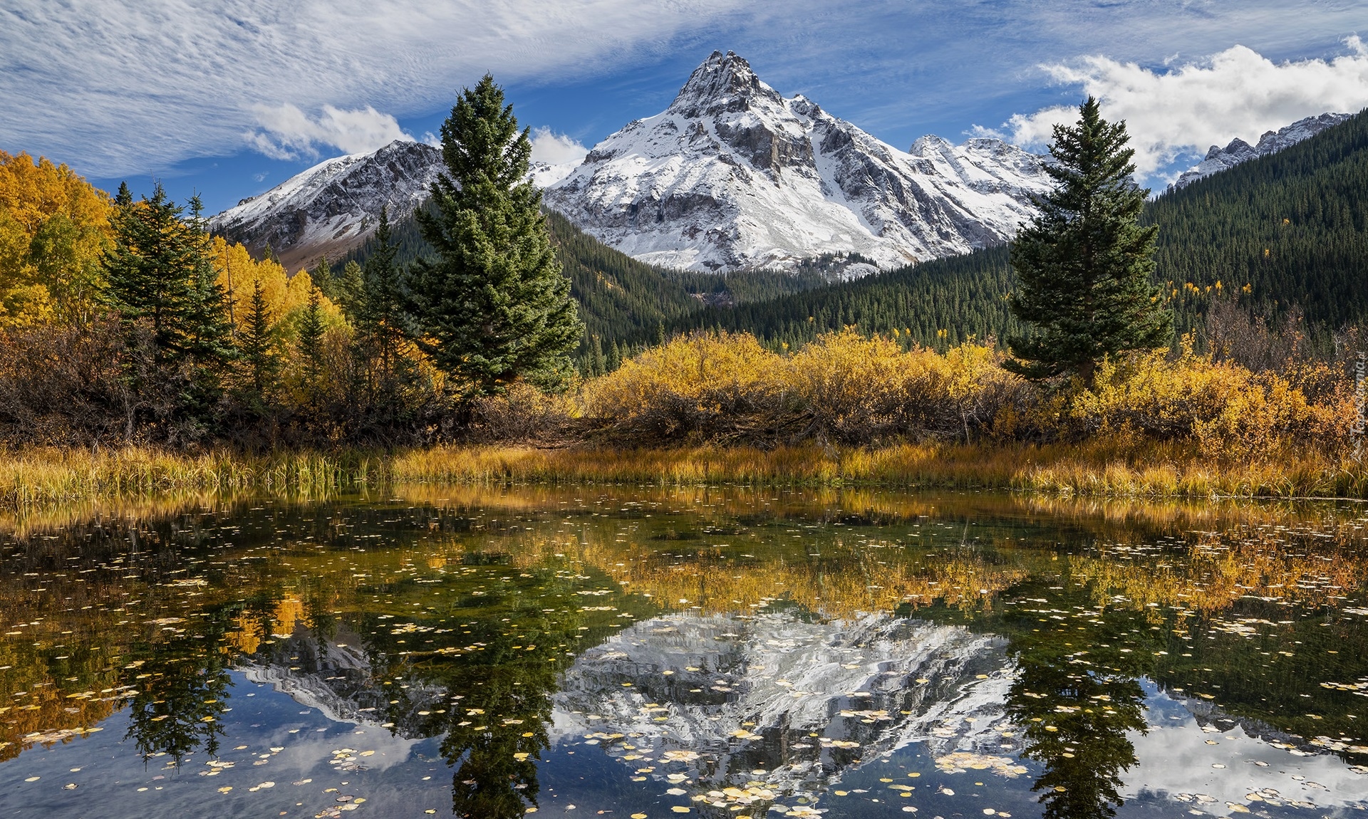 Edytor tapety: Odbicie pożółkłych drzew i ośnieżonych gór w jeziorze