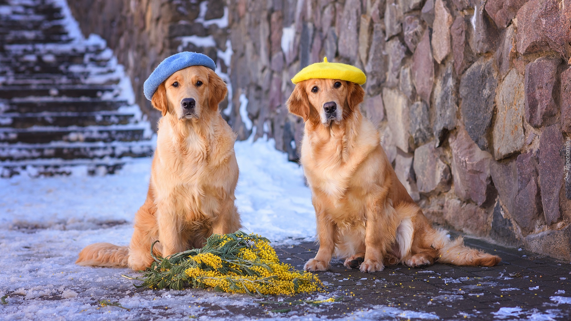 Edytor tapety: Dwa golden retrievery w beretach