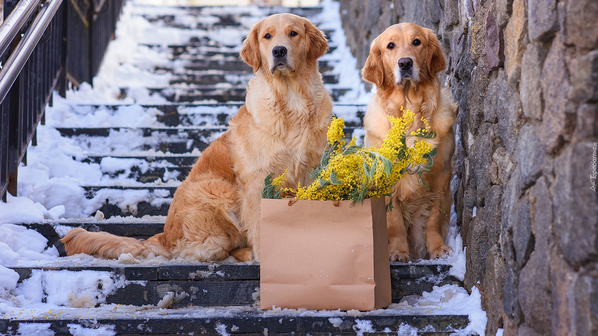Edytor tapety: Dwa golden retrievery na ośnieżonych schodach