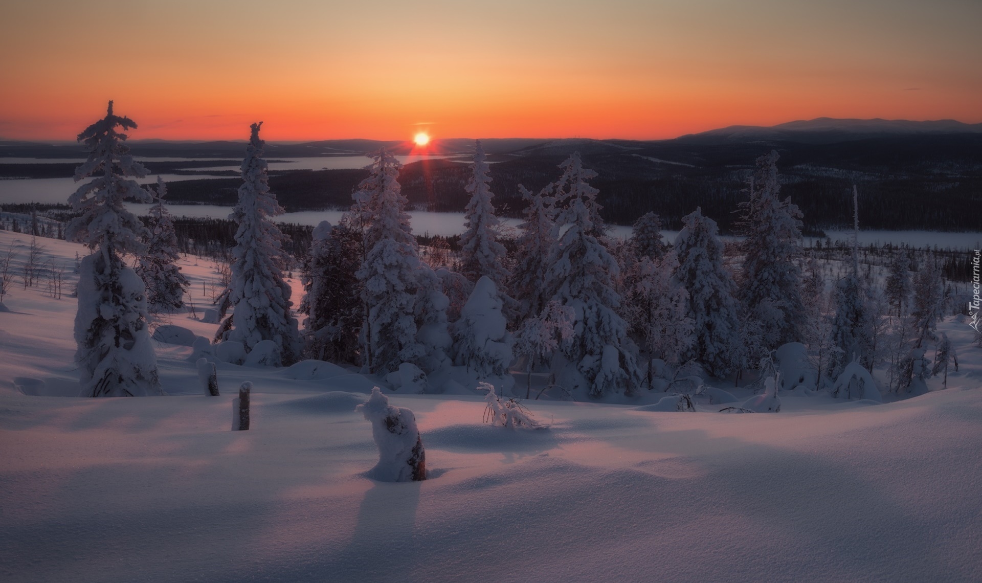 Edytor tapety: Zachód słońca w zimowej scenerii