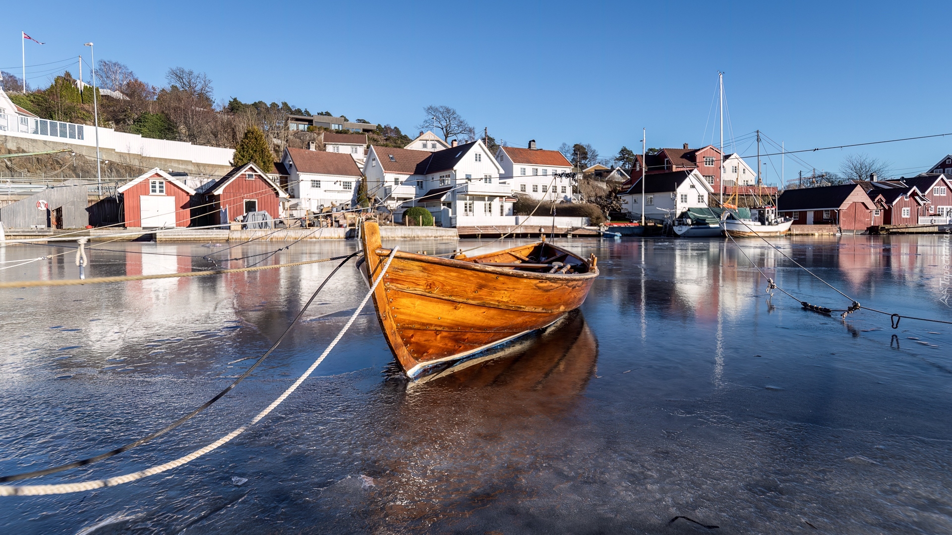 Edytor tapety: Łódka na tle domów przy brzegu jeziora