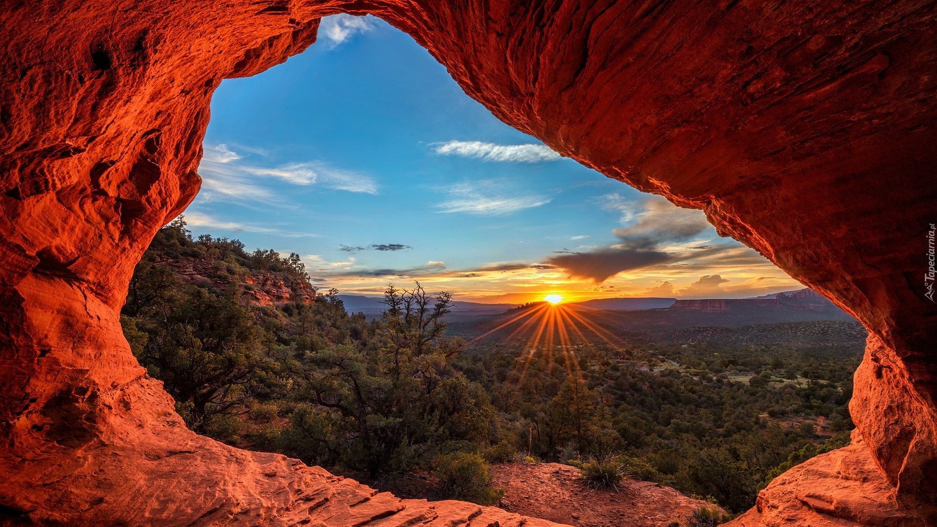Edytor tapety: Widok z otworu w skale na promienie słońca