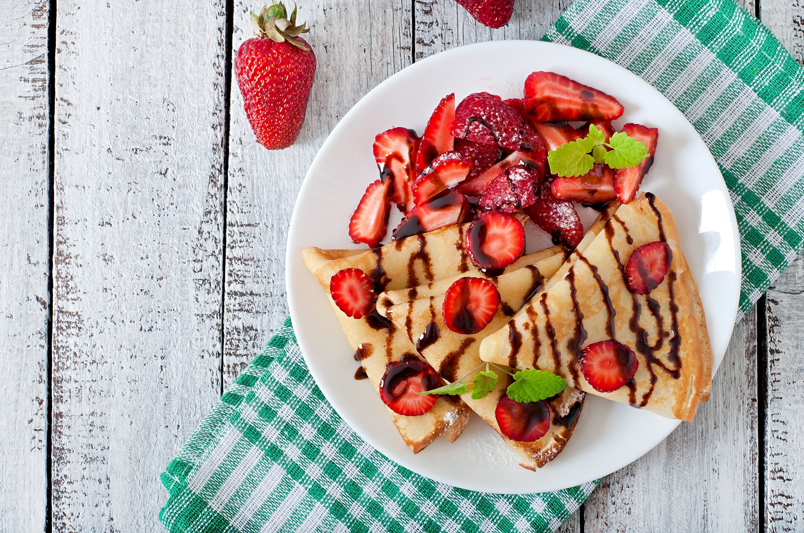 Edytor tapety: Naleśniki z truskawkami i czekoladą na talerzu