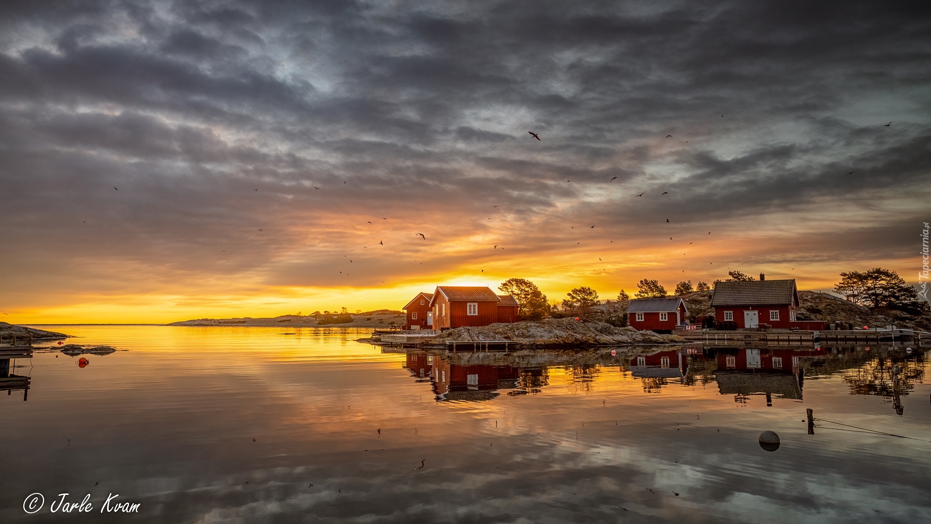 Edytor tapety: Ciemne chmury i zachód słońca nad czerwonymi domkami