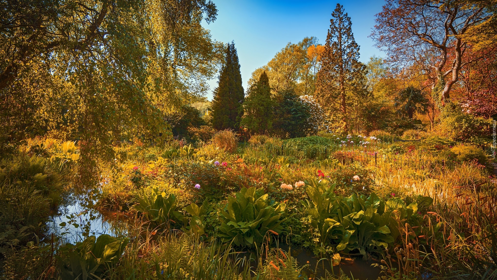 Edytor tapety: Rozświetlone jesienne drzewa i kwiaty w ogrodzie