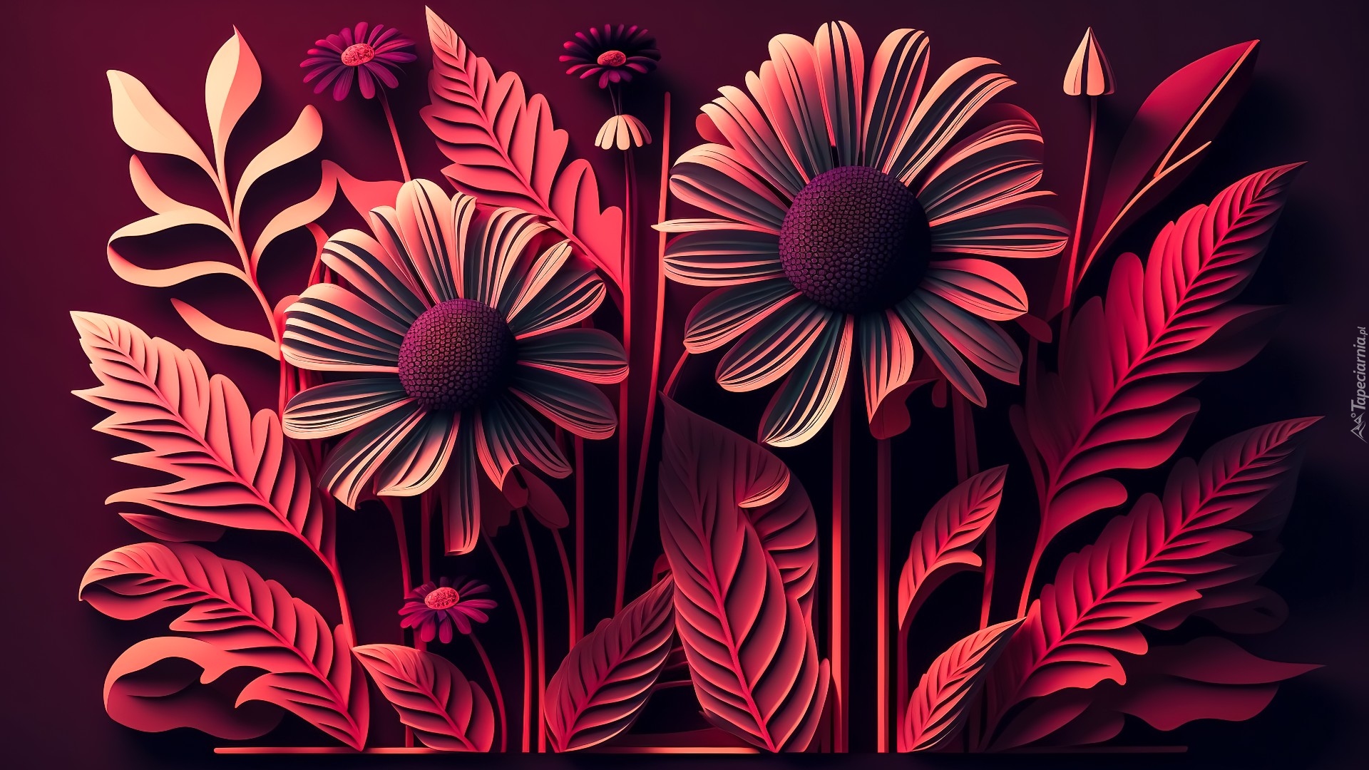Edytor tapety: Bordowe kwiaty i liście w grafice