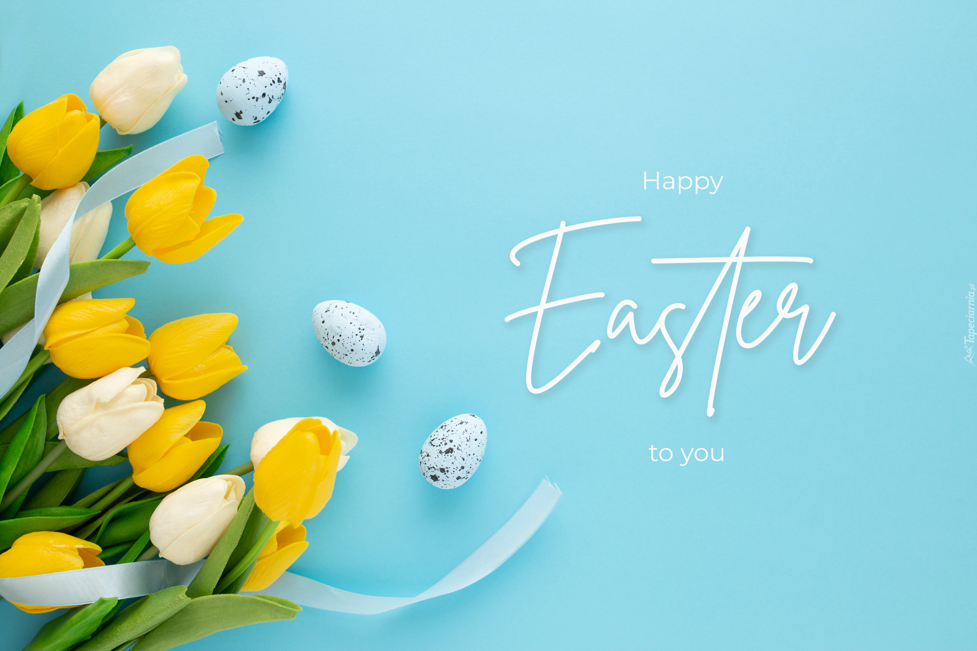 Edytor tapety: Tulipany i życzenia wielkanocne na niebieskim tle