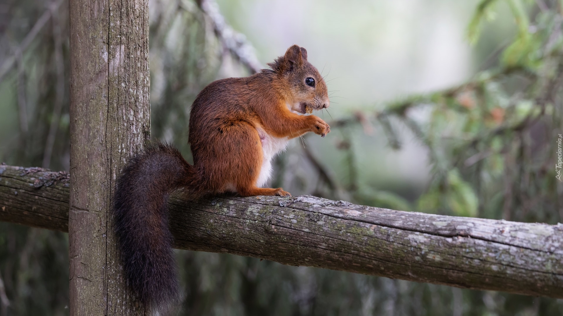 Edytor tapety: Ruda wiewiórka na drewnianej poręczy