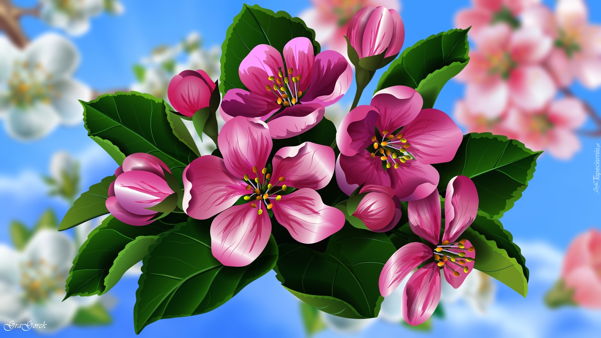 Edytor tapety: Gałązka z różowymi kwiatami drzewa owocowego w 2D