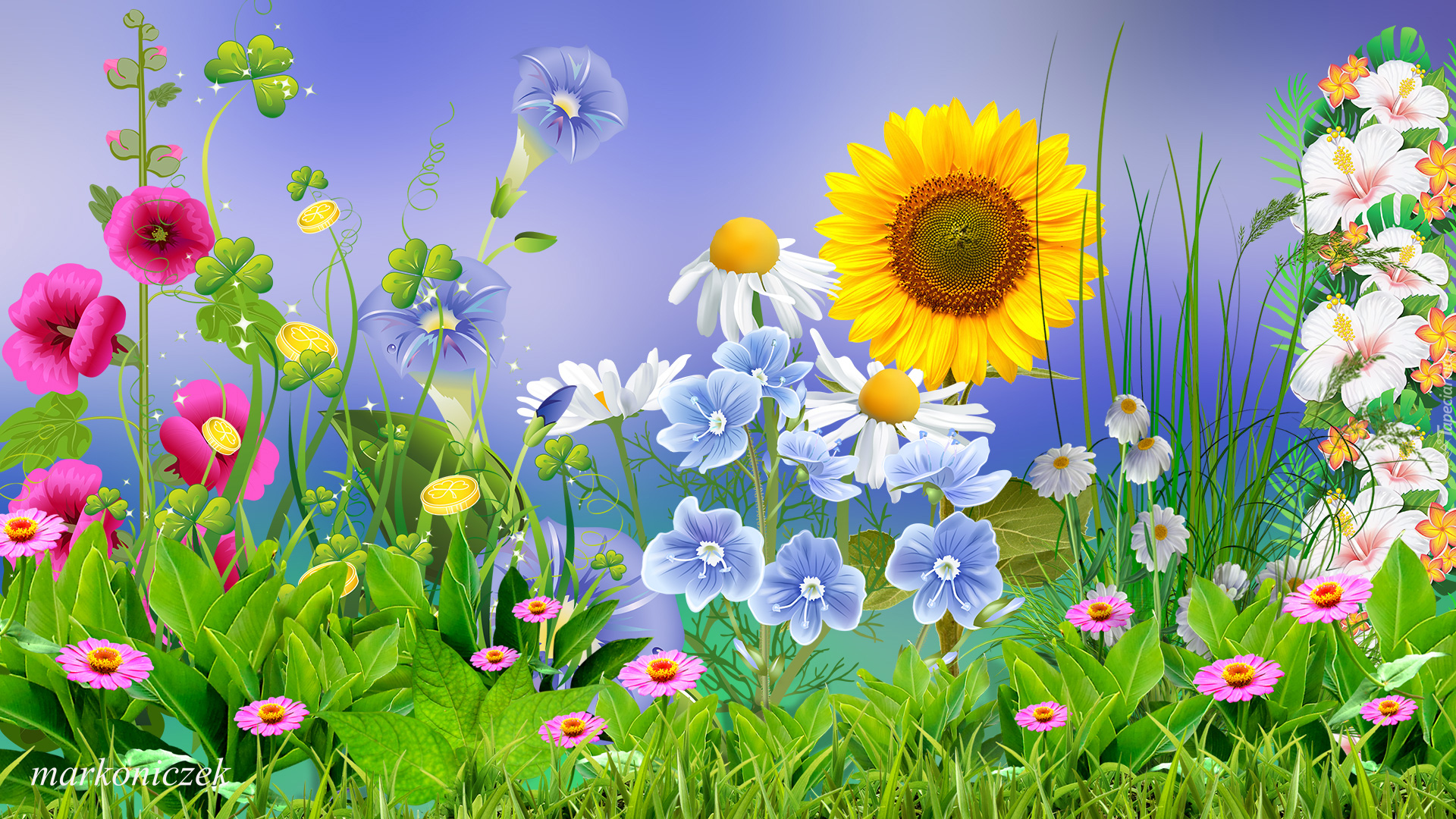 Edytor tapety: Kolorowe kwiaty na tle nieba w grafice 2D