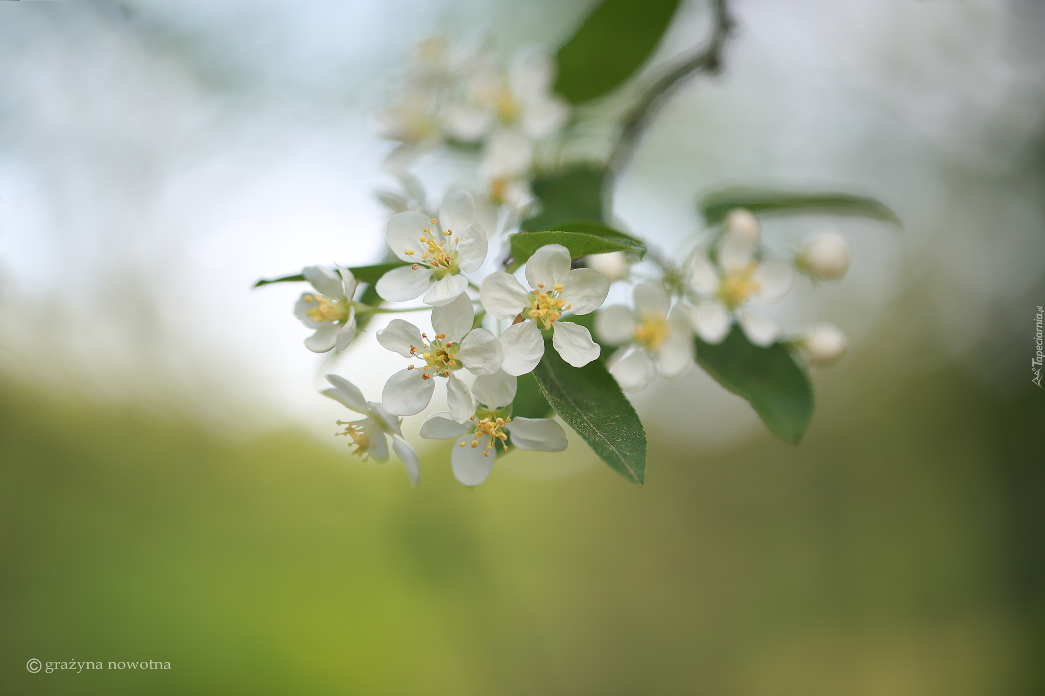 Edytor tapety: Białe kwiaty jabłoni na rozmytym tle