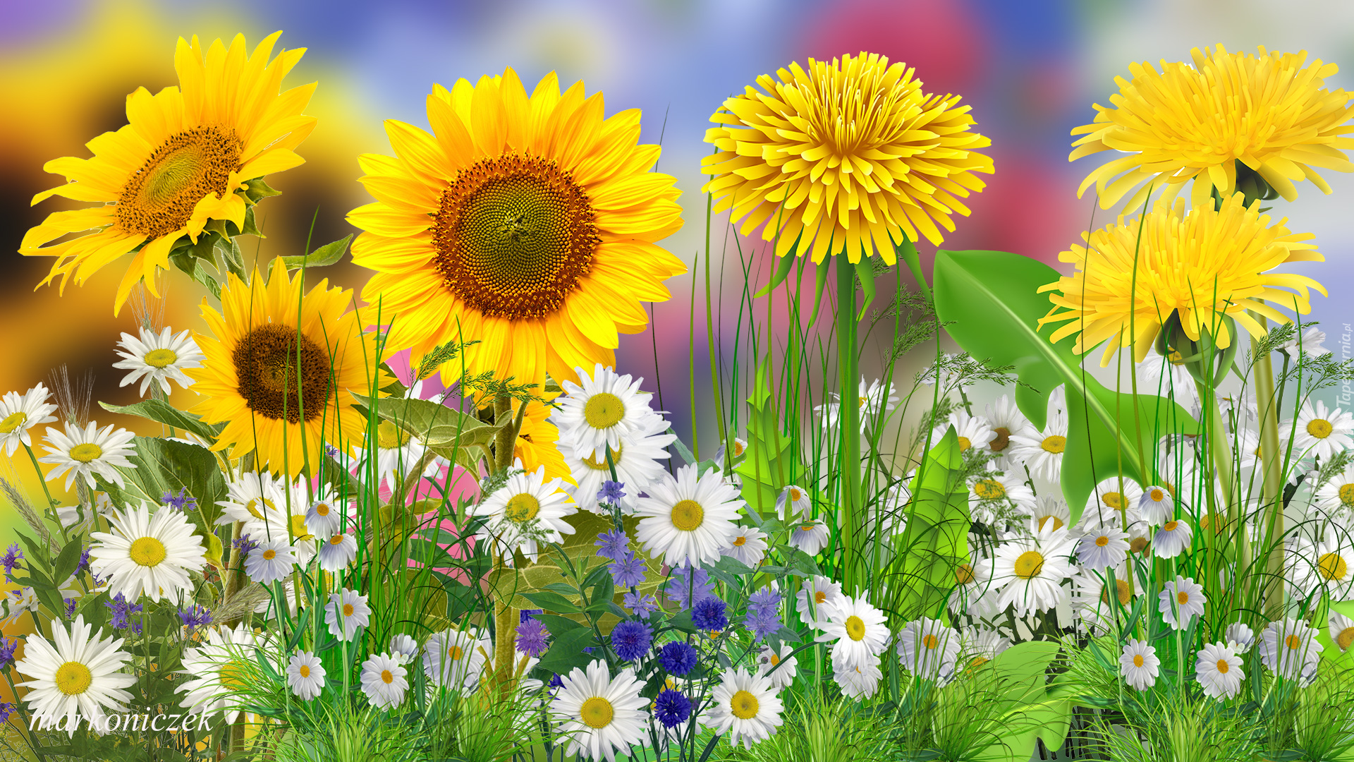 Edytor tapety: Słoneczniki i stokrotki pośród mniszka i habrów