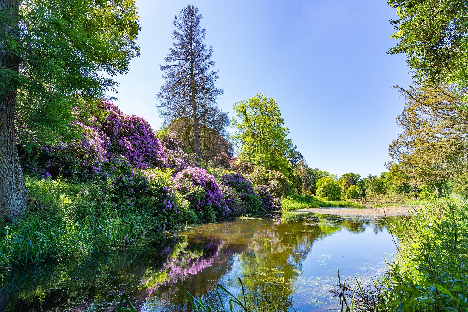 Edytor tapety: Drzewa i rododendrony nad stawem w słoneczny dzień
