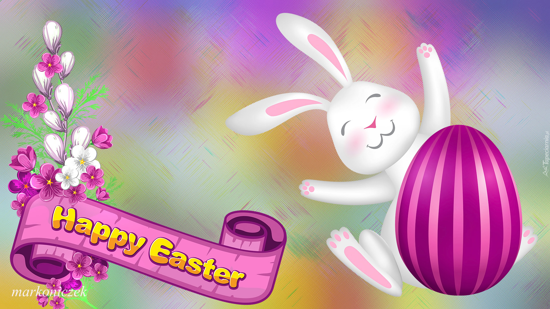 Edytor tapety: Zajączek z pisanką obok życzeń świątecznych