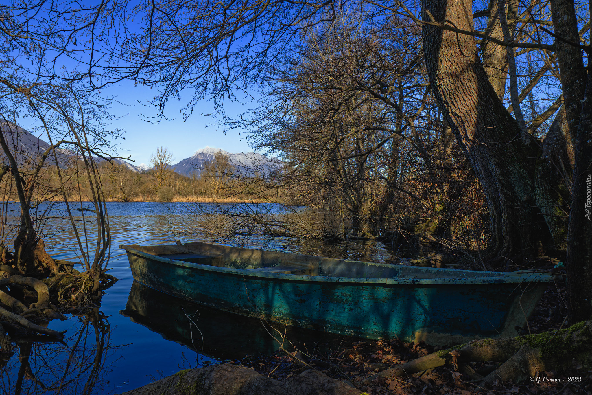 Edytor tapety: Niebieska łódka pod drzewami na brzegu jeziora
