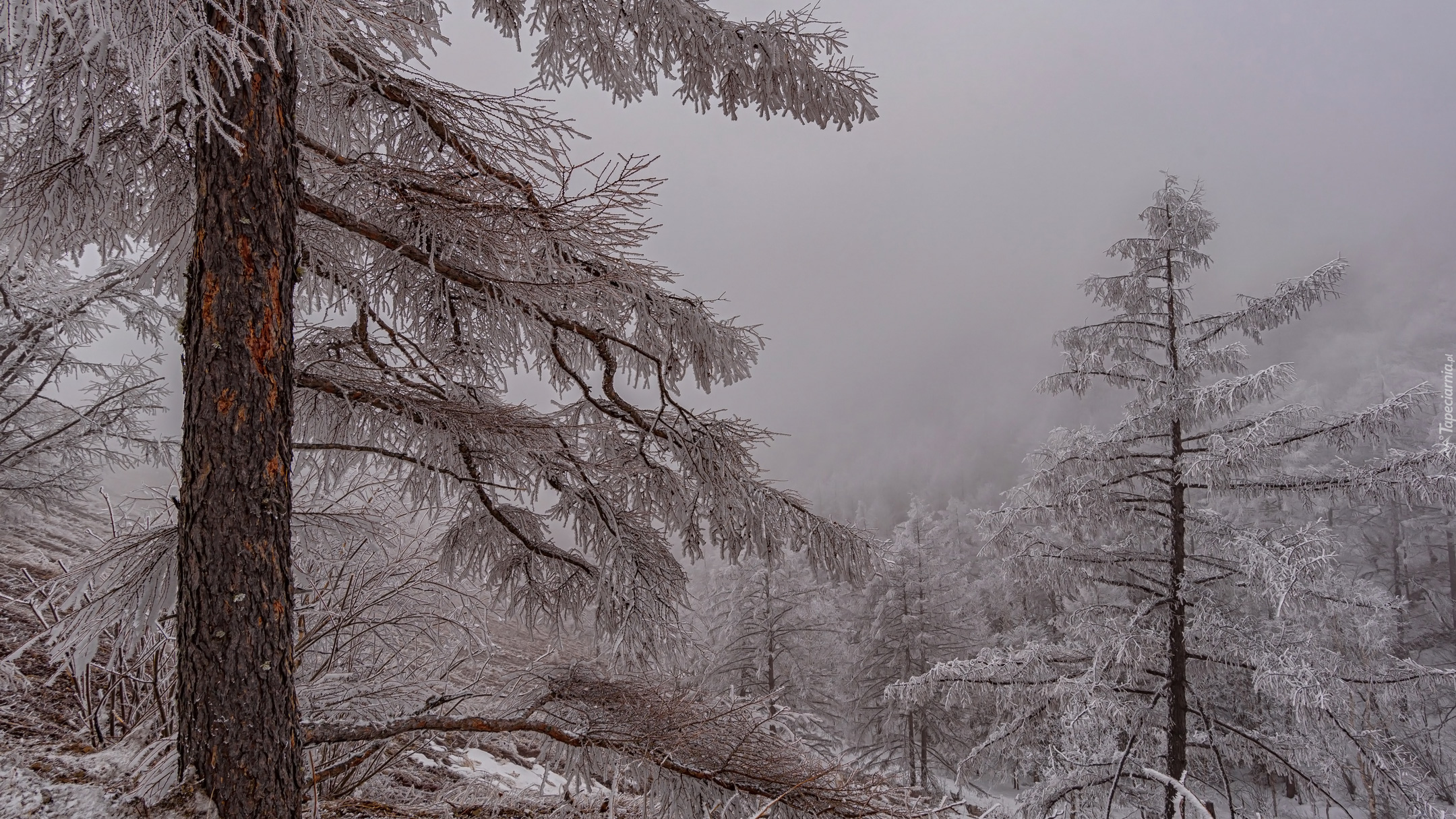 Edytor tapety: Oszronione drzewa iglaste na tle mgły nad lasem