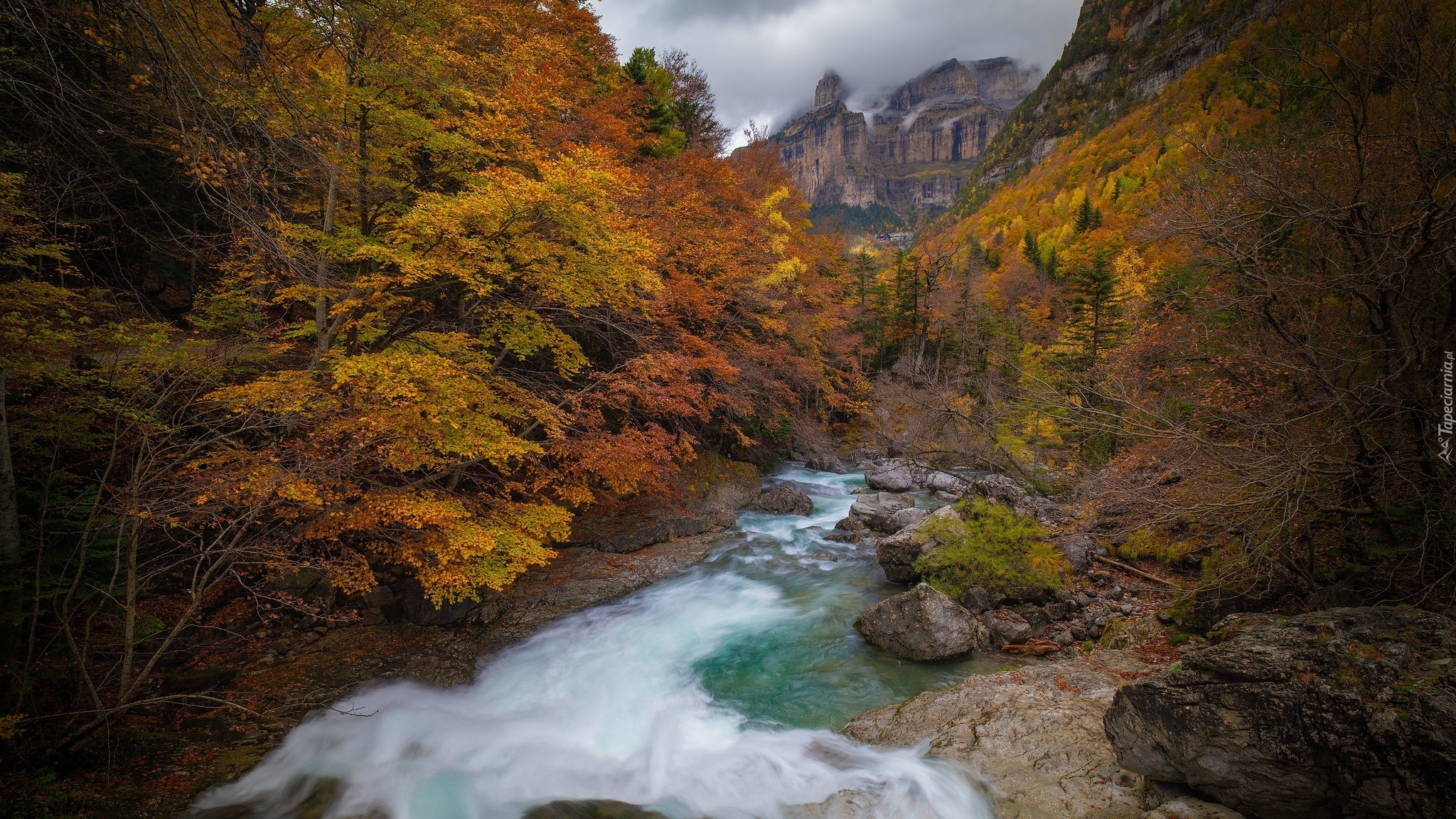 Edytor tapety: Jesienne drzewa i skały nad górską rzeką