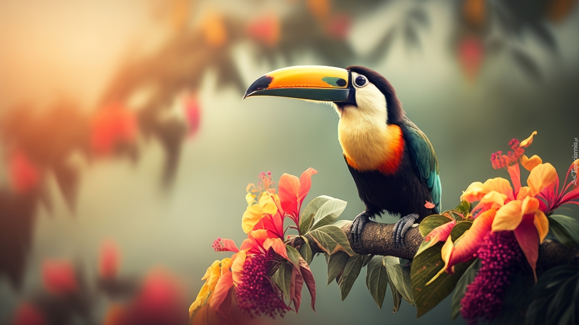 Edytor tapety: Tukan na ukwieconej gałęzi