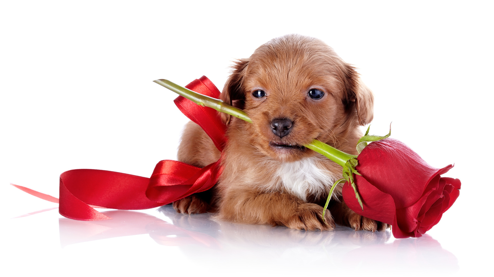 Edytor tapety: Szczeniak z czerwoną różą w pyszczku