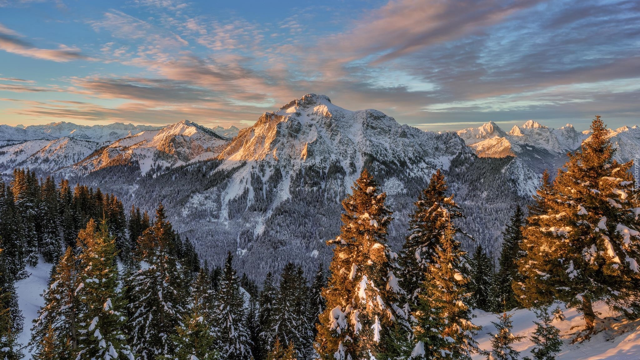 Edytor tapety: Rozświetlone ośnieżone drzewa i szczyty gór