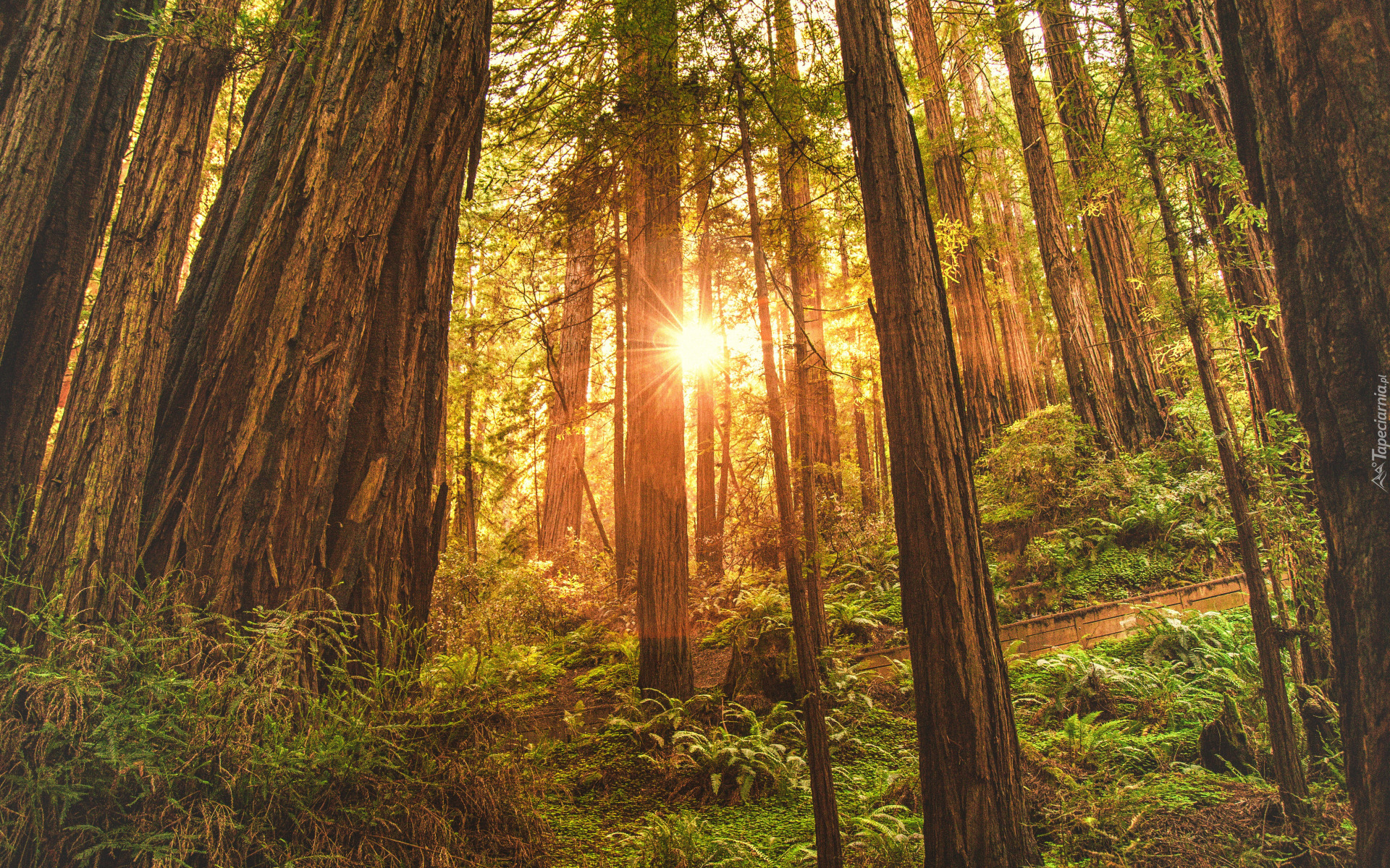 Edytor tapety: Wysokie drzewa w słonecznym lesie