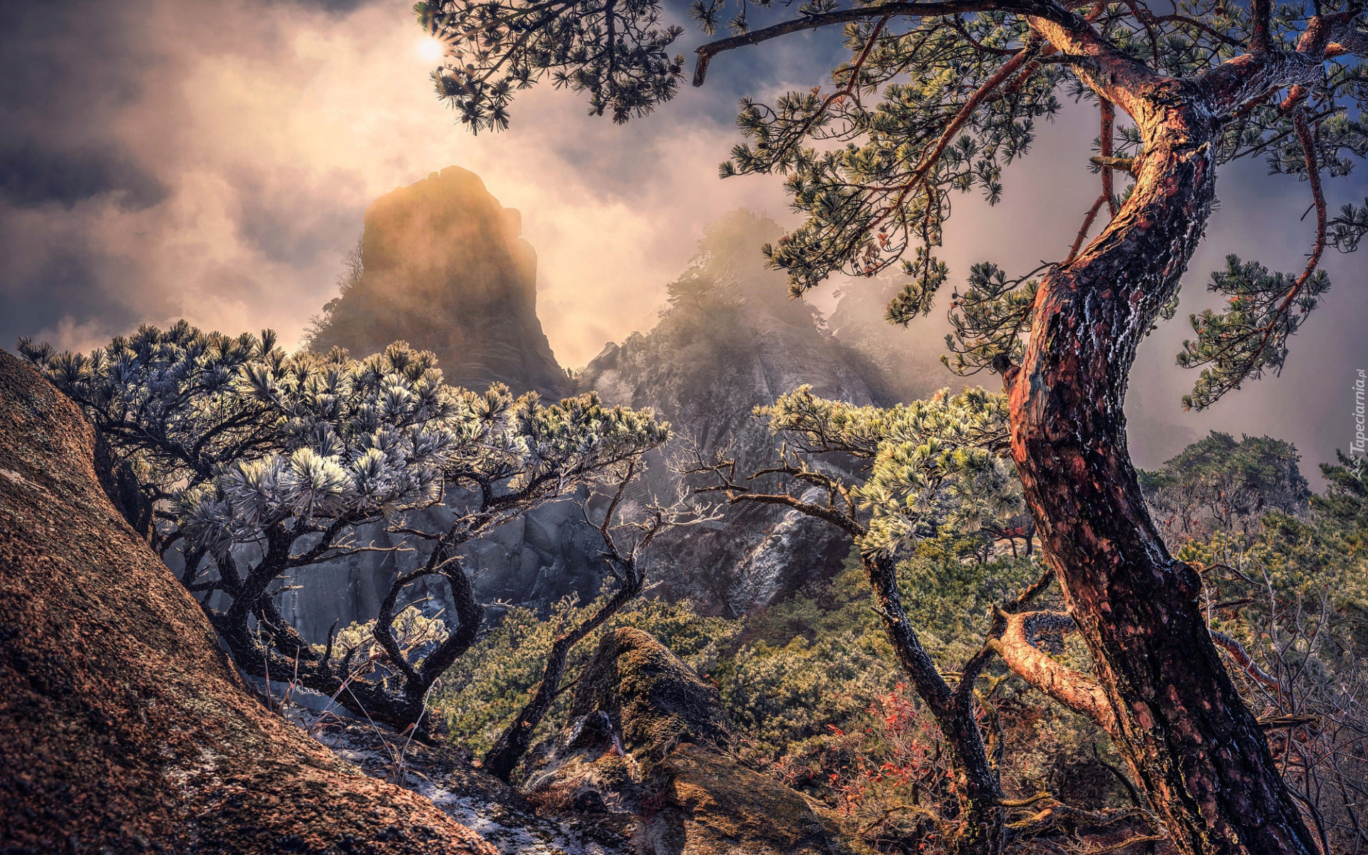 Edytor tapety: Sosny na skałach w zamglonych o poranku górach